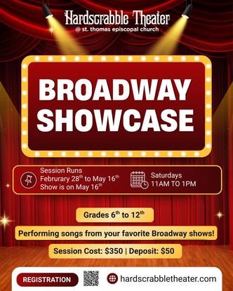 Join Hardscrabble Theater for our exciting Broadway Showcase, a dynamic performance program designed especially for students in grades 6–12! This engaging session gives young performers the chance to explore and perform songs from some of their favorite Broadway musicals while building skills in singing, acting, and stage presence.